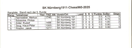 Liebe Schachfreundinnen und Schachfreunde, hiermit möchte ich Sie herzlich einladen, am Freitag, den 19. September 2025 in das Gemeindehaus St. Johannis am Palmplatz in Nürnberg zu unserem Sommerfest zu kommen, für das wir folgendes Programm geplant haben: 17:00 Uhr: Beginn bei Erfrischungsgetränken 18:00 Uhr: Siegerehrungen 19:00 Uhr: Abendessen vom Grill, anschließend Schachturnier Auch Angehörige unserer Vereinsmitglieder sind herzlich willkommen. Alle anfallenden Kosten werden von der...