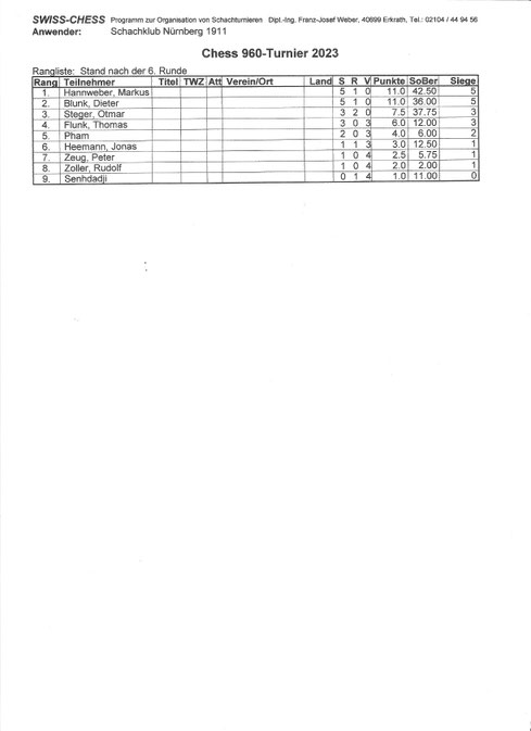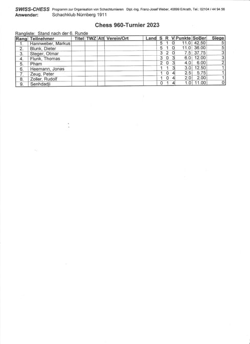 | Nr. | Teilnehmer | TWZ | 1 | 2 | 3 | 4 | 5 | 6 | Punkte | SoBerg |